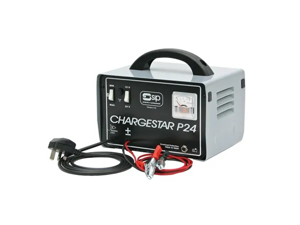 The SIP Professional Chargestar P24 is an Italian-made battery charger with 2 powerful charge rate settings, integrated ammeter and heavy-duty leads, perfect for garages and workshops.
