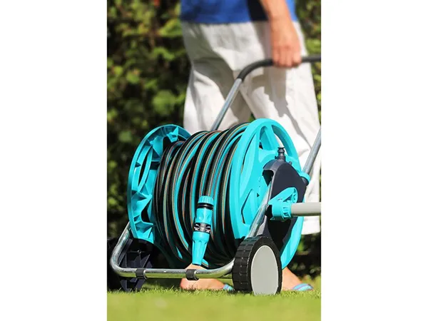 The Flopro+ Hose Cart has a rust-resistant aluminium frame with a comfort grip handle and reinforced wheels. It is designed to ensure that the hose does not twist or kink when winding.