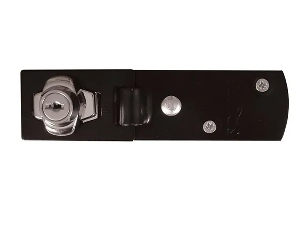 The Squire LH1 Locking Hasp, with anti-corrosion finish, single hinge, and hardened hasp, comes complete with a 4-disc tumbler lock.
