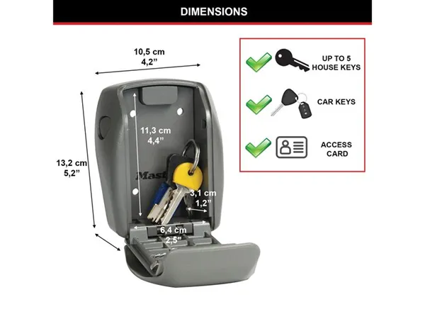 The Master Lock 5415E Wall-Mounted Reinforced Key Lock Box is a solid zinc body with dual locking levers and has a 4-digit resettable combination. Provides storage for keys, credit cards and more. Weather resistant and has a strong resistance to hammering and sawing attacks.