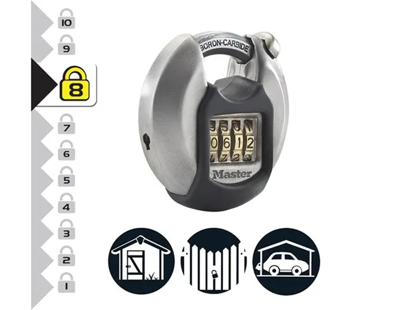 The Master Lock Excell™ Discus Combination Padlocks are made with cutting edge technology to deliver unprecedented security. They feature tough cut patented octagonal boron carbide shackles which are 50% tougher to cut than hardened steel.