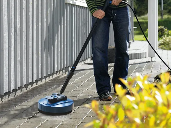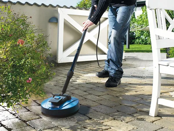 The Kew Nilfisk Alto Click&Clean Mid Patio Cleaner cleans medium to large domestic environment areas such as drives, patios and decks quickly and efficiently. Comes complete with two jet nozzles fitted to a spinning bar on the underside of the patio head. The pressure adjustment dial on the top of the cleaning head allows you to increase or decrease the cleaning forces depending on the surface you’re cleaning. It also has useful hand grips so you can clean vertical surfaces. It has an effective cleaning width of 220mm.