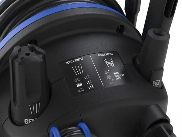 Standard features include a handy storage bucket for the Ultraflex high-pressure hose, and onboard storage for the assembled gun and lance, the Gentle and Rough cleaning nozzles, and the foam sprayer with detergent bottle. To help with the choice of cleaning nozzles there is a selection guide just where you need it, printed on the machine where the nozzles are stored. Its power cable can be securely stowed away using a neat retaining storage strap on the rear of the machine.