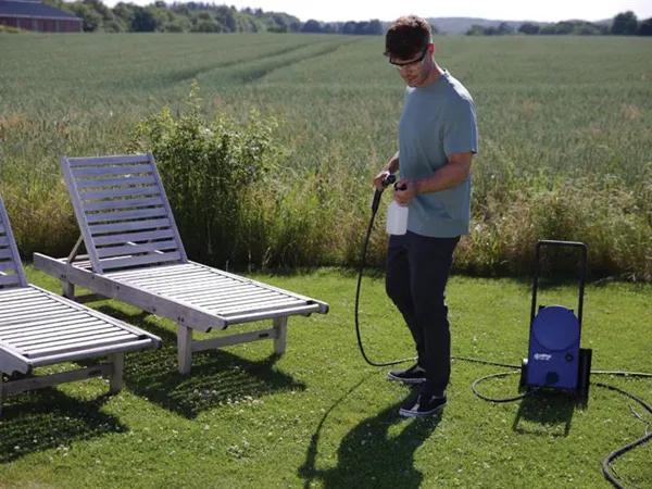 It has a reliable and long-lasting air-cooled universal motor, aluminium pump head, and auto start/stop. Quick connection of hose to the integrated swivel function on the handle and the new quick connect system of the hose to the machine, completes the easy assembly prior to use. It can also be operated from a standing water source such as a water butt tap.