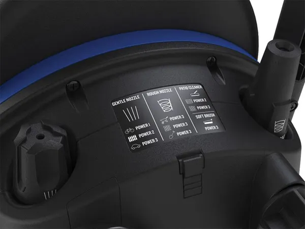 It features an internal hose reel, connecting the Ultraflex high-pressure hose directly to the pump. The hose guide is built into the machine casing, so the Ultraflex high-pressure hose is always tidily stored away before and after use. With onboard storage for the assembled gun and lance, the Gentle and Rough cleaning nozzles, and the foam sprayer with detergent bottle. To help with the choice of cleaning nozzles there is a selection guide just where you need it, printed on the machine where the nozzles are stored. Its power cable can be securely stowed away using a neat retaining storage strap on the rear of the machine.
