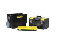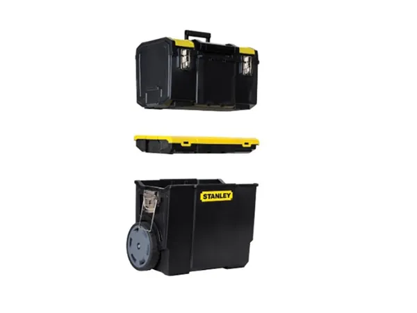 This Stanley 3-in-1 Mobile Work Centre has a detachable toolbox unit with small parts storage on top and a detachable mid-section for small parts and accessories. The bottom bin has large 7-inch wheels and the pull handle on top allows for easy convenient manoeuvrability.