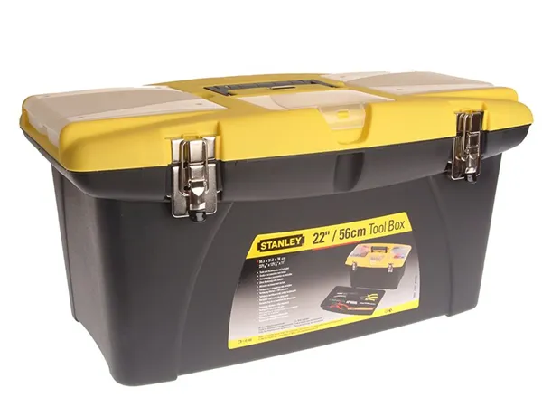 The Jumbo organiser toolbox is ideal for transporting and storing multiple tools and has 2 removable organisers for storing small parts. Metal latches provide secure locking of the toolbox. There is a fixed organiser for screwdriver bits in the lid along with a removable tote tray. The easy grip handle folds flat when not in use.