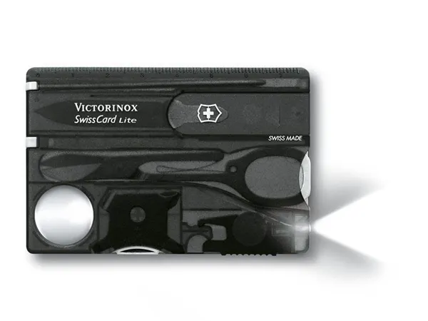 The SwissCard Lite has a letter opener/blade, small scissors, stainless steel pin, tweezers, pressurised ballpoint pen, ruler in cm and inches, magnifying glass, 3mm screwdriver, 5mm screwdriver, Phillips screwdriver 00-0, Phillips screwdriver 1-2 and an LED light.