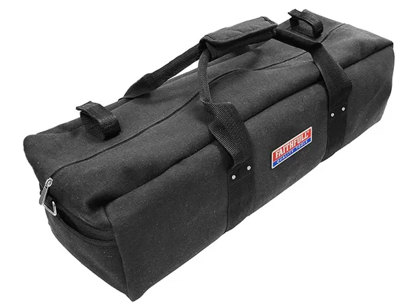 The Faithfull Zip Top Holdall is made from a strong durable canvas featuring reinforced handles, heavy-duty zip fastener and a studded fibreboard base, end pockets and a level holder.